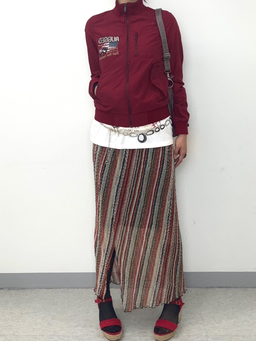 - 레드 톤의 컬러풀한 사선 스트라이프 패턴과 밑단 슬릿 디자인이 매력적인 플리츠 스커트