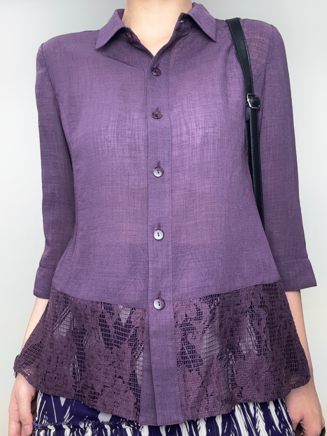 - 플로럴 패턴의 레이스가 돋보이는 바이올렛 컬러의 블라우스