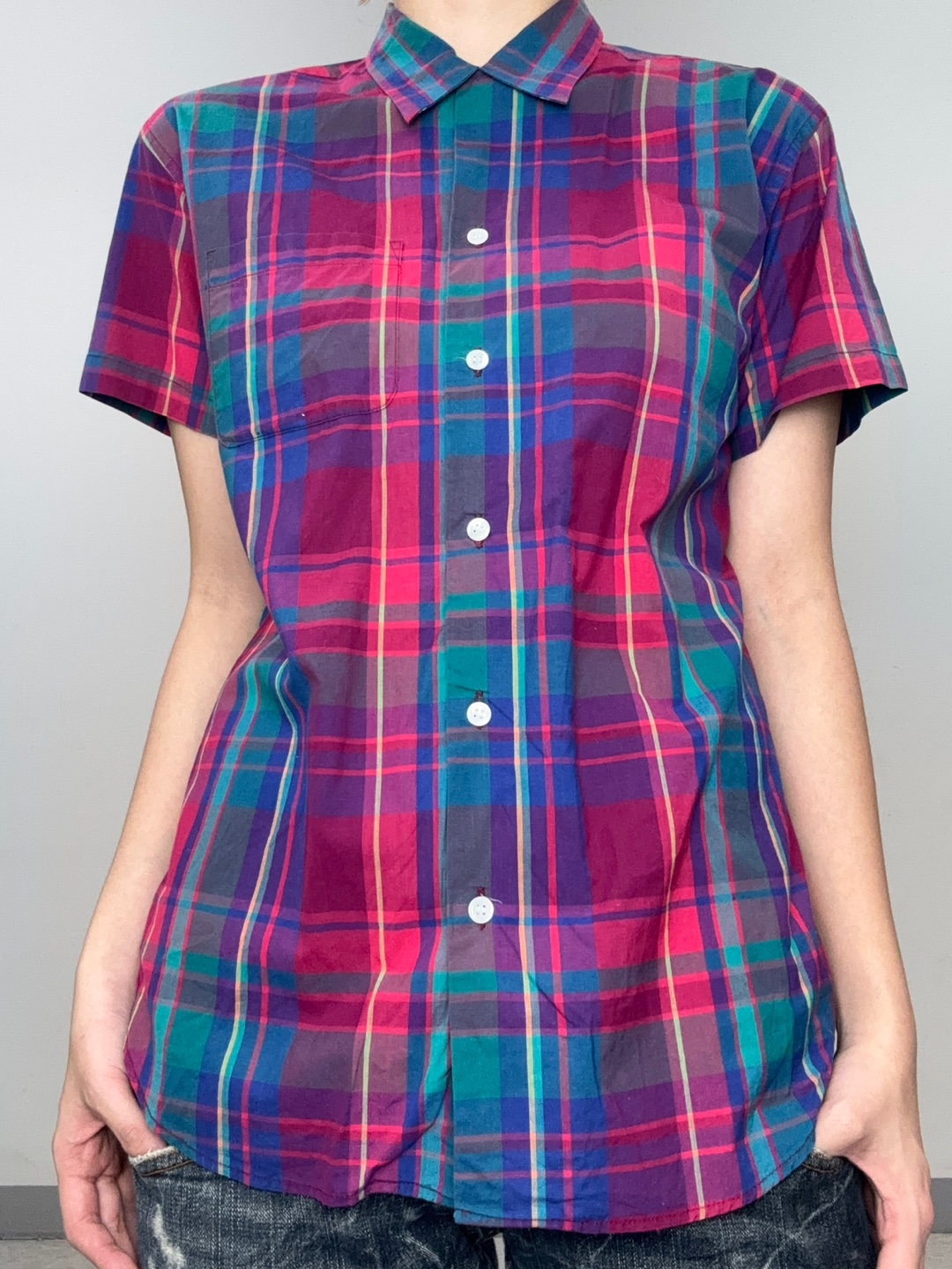 - 진한 핑크&그린&블루 컬러의 체크 패턴이 덧대어진 반소매 셔츠